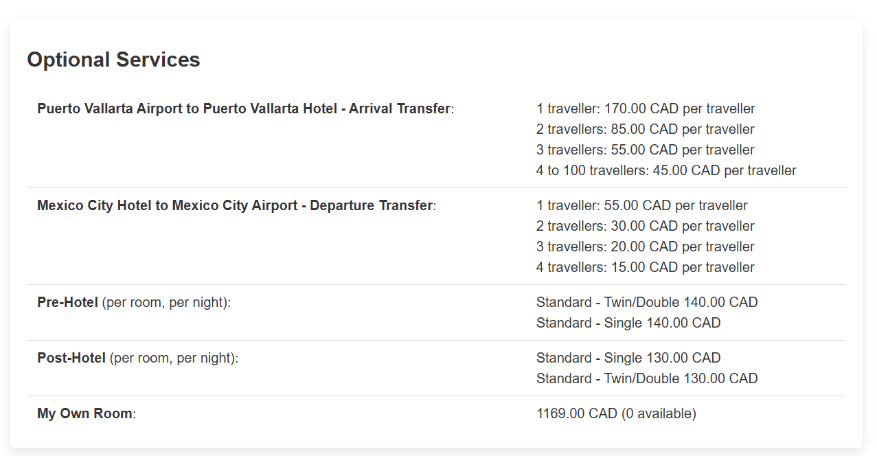 لحظه خوراکیها: تور شهر گواناخواتو و خیابانهای غذا، بازدید از کارخانه تکیلا با تست و ناهار، تور شهر گوادالاخارا، پیادهروی آشنایی در سن میگل د آلنده، تور شهر سن میگل د آلنده، وقت آزاد در پورتو والارتا، گوادالاخارا، سن میگل د آلنده و مکزیکو سیتی. تمام حملونقل بین مقصدها و فعالیتهای شامل شده در سفر.